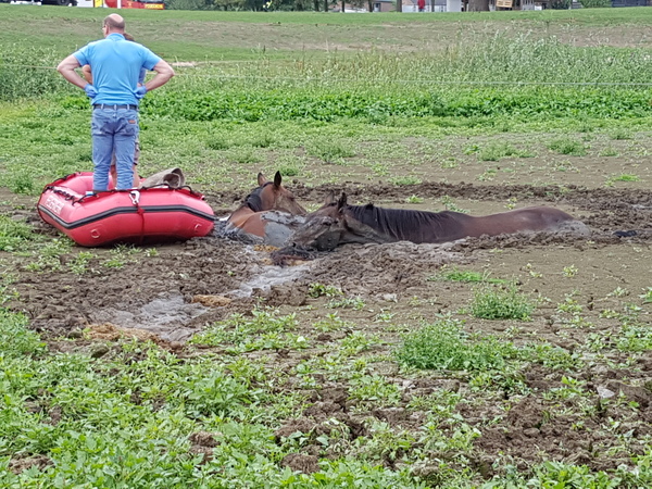 Das Vordringen zu den eingesunkenen Pferden war wegen des aufgeweichten Bodens sehr schwierig. Der herbeigerufene Tierarzt konnte zunächst nur per Schlauchboot an die Tiere heran. Jetzt war Kreativität gefragt: Es wurden durch ein ortsansässiges Tiefbauunternehmen mehrere Bagger an der Einsatzstelle zur Verfügung gestellt. Auch Metallplatten zur Stabilisierung des Untergrundes wurden angefordert. Gegen 12:50 Uhr konnte dann das erste Tier mit Hilfe eines Kettenbaggers aus dem Kolk gezogen werden. Das zweite Pferd konnte schließlich gegen 14:00 Uhr befreit werden.