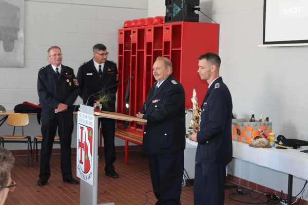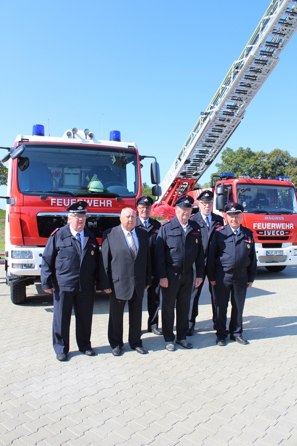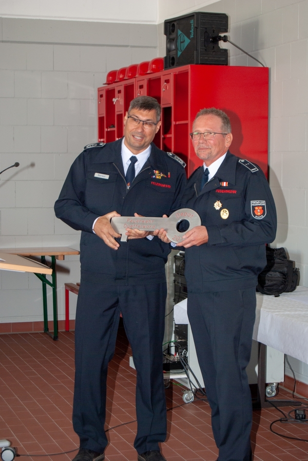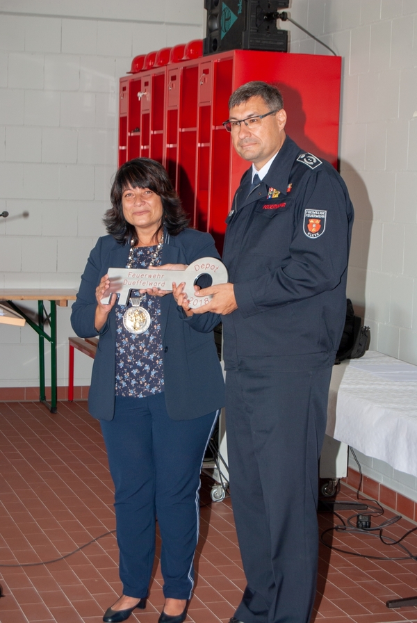 In ihrer Ansprache lobte Bürgermeisterin Northing einmal mehr den unermüdlichen Einsatz der Feuerwehrleute. Besonders stolz machte Sie, dass es sich um das erste Bauprojekt handelte, dass sie von der Planung bis zur Fertigstellung begleiten durfte. Den symbolischen Schlüssel übergab Sie zunächst an Ralf Benkel, den Leiter der Feuerwehr Kleve. Dieser betonte noch einmal die Notwendigkeit des Neubaus und zeigte sich mit der Ausführung sehr zufrieden. Er wünschte der Löschgruppe Düffelward alles Gute mit dem neuen Gerätehaus und übergab den Schlüssel schließlich an Löschgruppenführer Udo van Brakel.