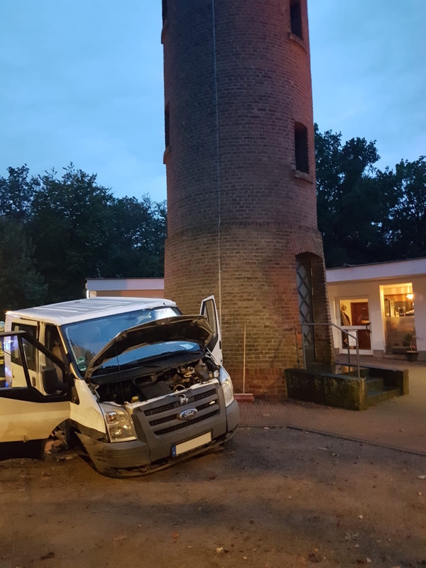 Am Sonntagabend (20. Oktober 2019) gegen viertel vor sieben staunten die Mitglieder des Löschzuges Kleve nicht schlecht, als sie zu einem Verkehrsunfall an der Königsallee in Kleve gerufen wurden. Ein Lieferwagen war mit dem Aussichtsturm auf dem Klever Berg kollidiert.