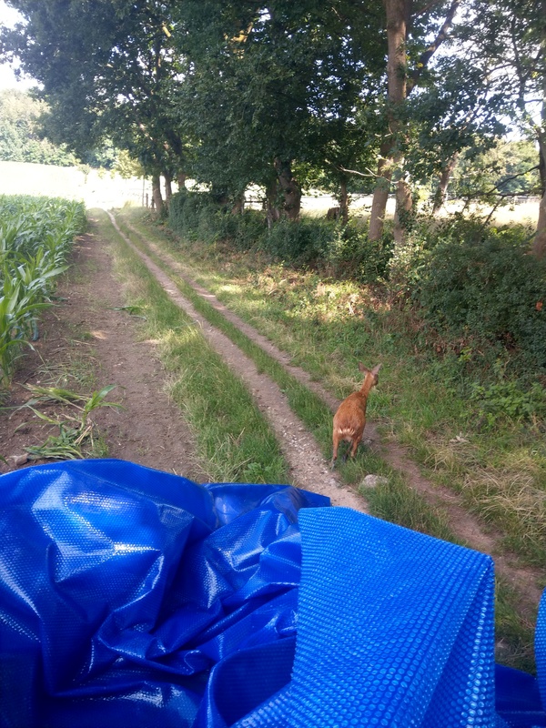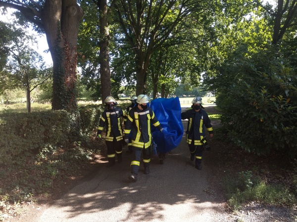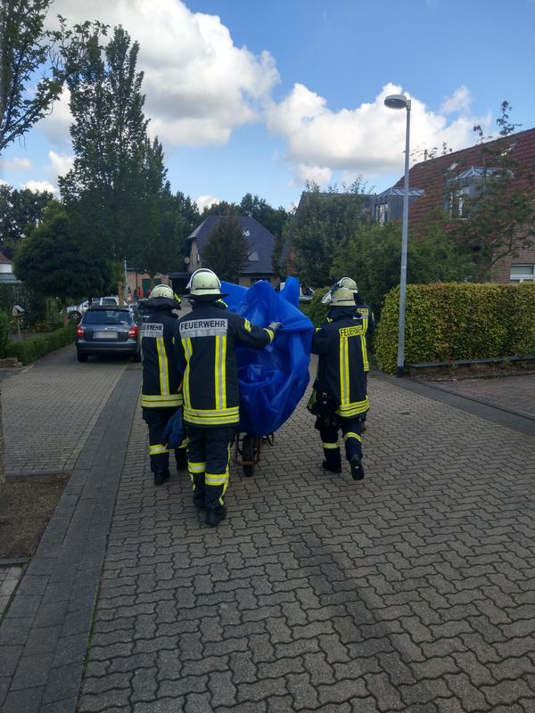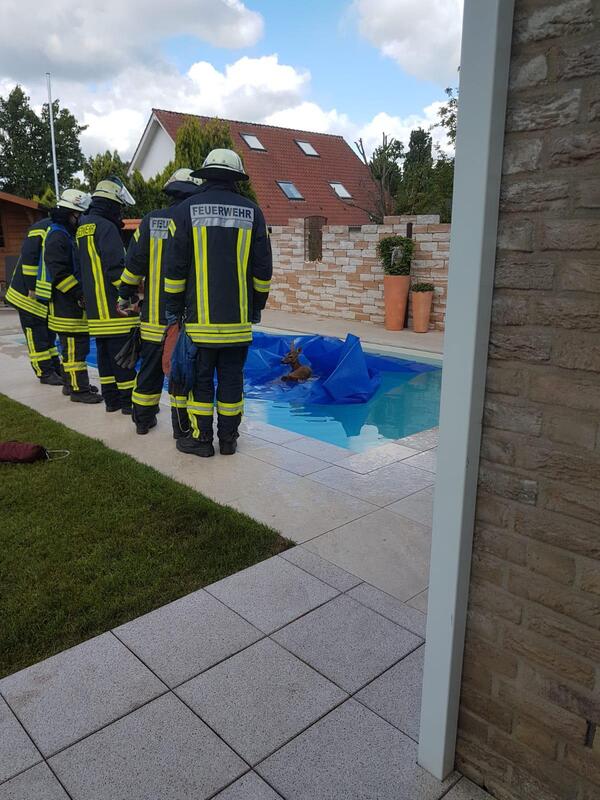 Das junge Reh war in einen in den Boden eingelassenen Pool gefallen, der mit einer Kunststoffplane abgedeckt war. Es konnte sich von dort nicht selber befreien und verharrte somit auf der Plane. Wie lange es dort schon so gelegen hatte, ist unklar. Bei Eintreffen der Feuerwehr machte es einen geschwächten Eindruck, so dass es die folgende Rettung widerstandslos über sich ergehen ließ. Mit vereinten Kräften konnte das Reh mit der Plane an den Beckenrand gezogen und eingepackt werden. Mittels einer Schubkarre wurde das Tier behutsam zum nahegelegenen Waldrand gefahren. Wenige Sekunden nachdem die Plane geöffnet wurde, sprang das Reh auf und lief schnellen Schrittes Richtung Wald.