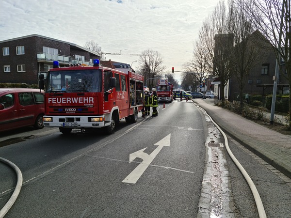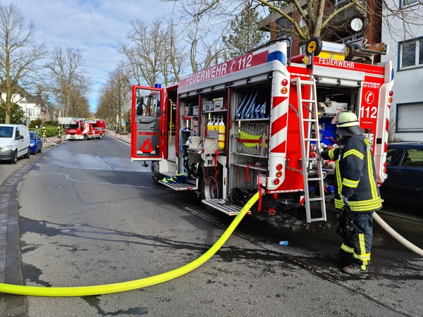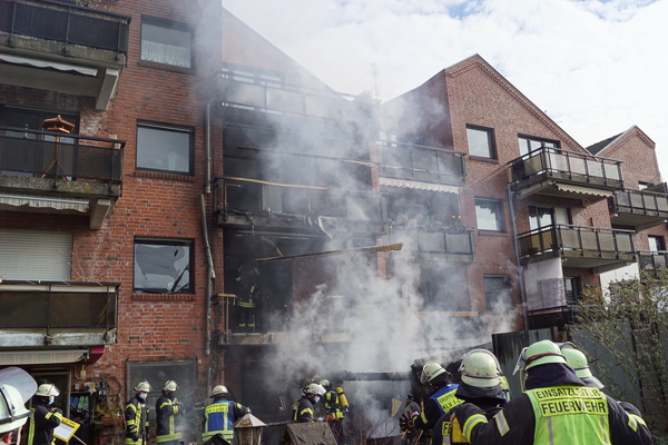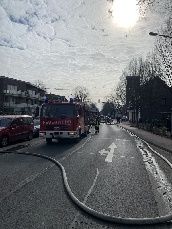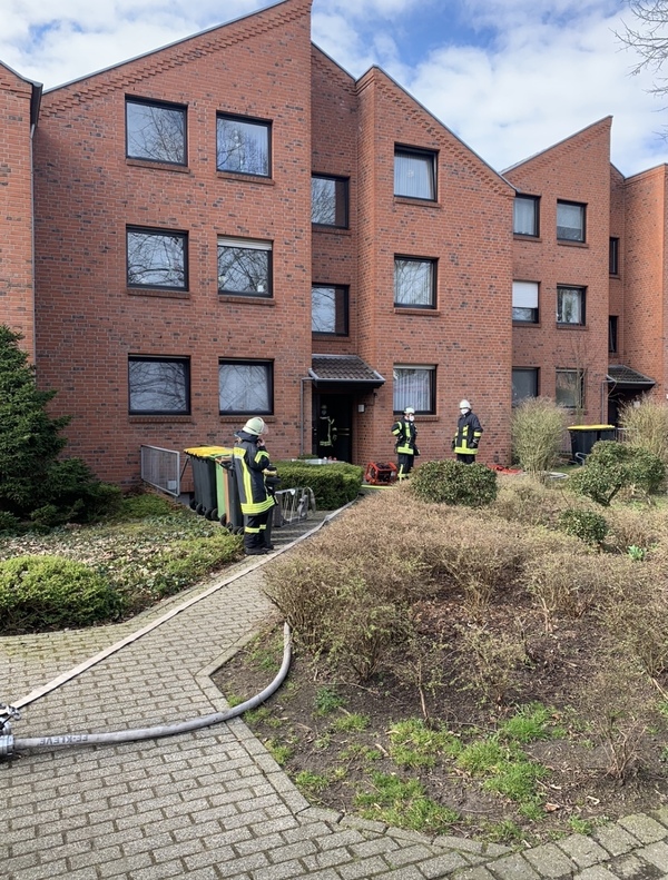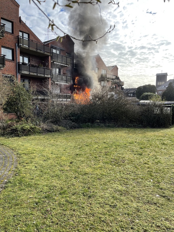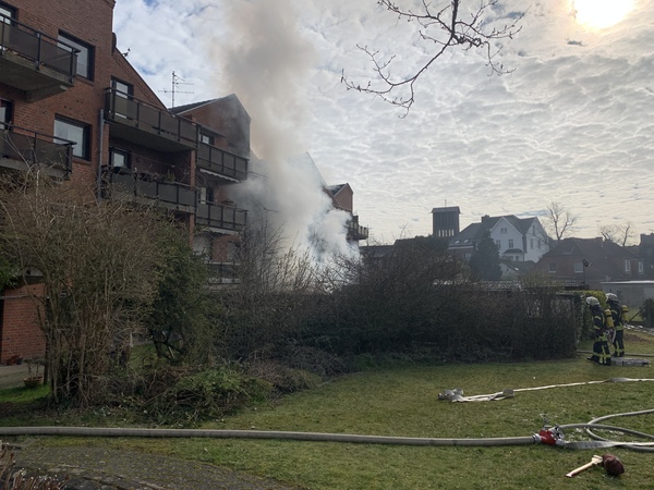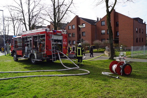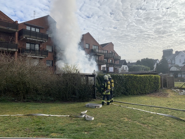 Gegen 9:35 ging der Alarm für die Löschzüge Kleve und -Süd (Materborn / Reichswalde) ein. Einsatzleiter StBI Ralf Benkel fand einen brennenden Anbau an der rückwärtigen Seite des Wohngebäudes vor. Sofort wurden zwei Trupps unter Atemschutz zur Brandbekämpfung eingesetzt. Parallel wurde das Gebäude evakuiert, da das Feuer bereits auf einen angrenzenden Balkon übergegriffen hatte. Ein Trupp ging in das Gebäude vor und verhinderte die Brandausbreitung über den Balkon, während der andere Trupp das Gartenhäuschen von außen löschte. Durch die starke Hitze waren schon Fensterscheiben in der unteren Wohnung geborsten und Rauch drang ein. Daher wurde ein Hochleistungslüfter in Stellung gebracht. Insgesamt waren drei Strahlrohre im Einsatz und das Feuer konnte schnell gelöscht werden. Letztendlich waren mehrere Wohnungen durch die Rauchentwicklung betroffen. Das Gebäude wurde später gemeinsam mit der Polizei kontrolliert. Im Einsatz waren 44 Einsatzkräfte der Feuerwehr Kleve.