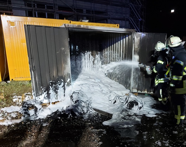 Zur Brandbekämpfung musste der Container aufgebrochen werden. Der Löschzug Kellen nahm ein C-Strahlrohr vor und konnte so das Feuer schnell unter Kontrolle bringen. Ein weiteres C-Strahlrohr wurde in Riegelstellung eingesetzt, um die angrenzenden Containern zu schützen. Zum Abschluss wurde das Brandgut noch mit Schaum abgedeckt.