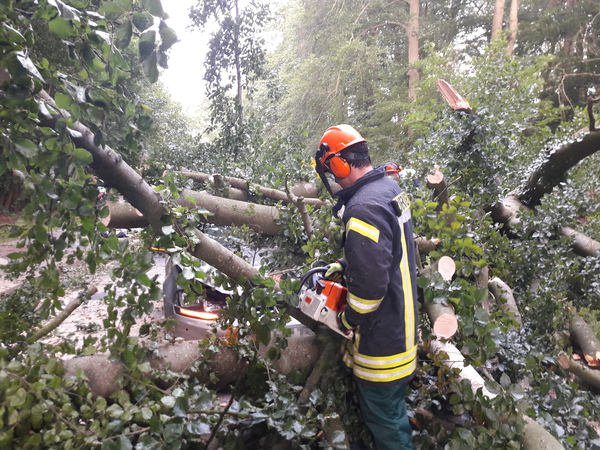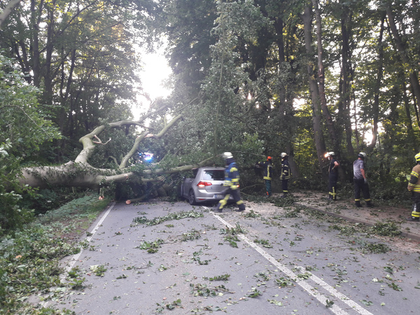 Eine Autofahrerin war gestern Abend (28. Juli 2021) auf der Uedemer Straße Richtung Kleve unterwegs, als eine mächtige Buche auf ihr Fahrzeug stürzte. Die Frau konnte das Fahrzeug eigenständig verlassen. Die Uedemer Straße war über Stunden in beide Richtungen voll gesperrt.