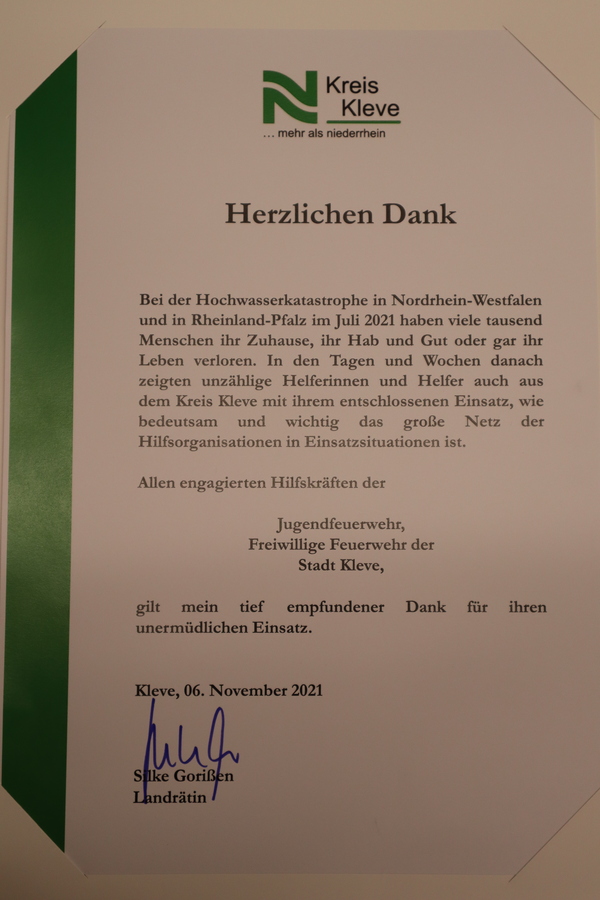 Die Feuerwehr Kleve freut sich über die Wertschätzung der Arbeit im Rahmen der Fluthilfe im Ahrtal. Landrätin Silke Gorißen hatte Vertreter der Helfer zu einer Dankveranstaltung am Samstag, dem 6. November 2021 ins Wunderland nach Kalkar eingeladen. Die einzelnen Einheiten, die sich an den Hilfsaktionen beteiligt hatten, bekamen individuelle Urkunden. Auch die Jugendfeuerwehr Kleve hatte sich beteiligt und empfing eine eigene Urkunde.