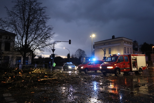 In der Nacht vom 16. bis zum Morgen des 17. Februar 2022 musste die Feuerwehr Kleve mehrmals zu sturmbedingten Einsätzen ausrücken. Neben einigen Bäumen, die auf Straßen gefallen waren, galt es auch, das Zelt eines Corona-Testzentrums zu sichern. Des Weiteren hatten sich Module einer Photovoltaik-Anlage gelöst und waren auf die Straße geweht. Ein großer Baum war auf die Kreuzung Gruftstraße/Tiergartenstraße gefallen und hat eine Laterne und Teile der Ampelanlage mitgerissen.