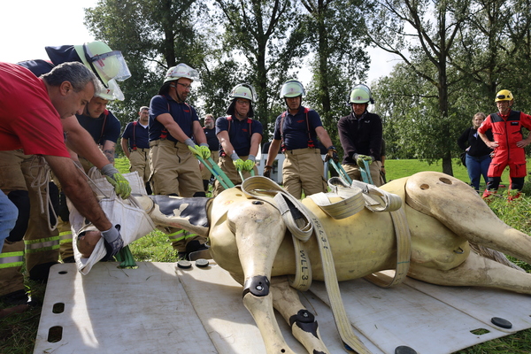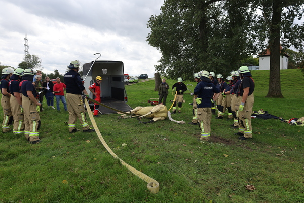 Um die Techniken praktisch zu trainieren, ging es nach der Mittagspause an den Kellener Deich, wo der Pferdedummy „Sam“ wartete, der alle Rettungsversuche geduldig über sich ergehen ließ. So wurde zum Beispiel das Hochziehen aus einem Wassergraben geübt oder auch das Retten eines gestützten Pferdes aus einem Anhänger. Zuletzt wurde auch trainiert, das Übungspferd mit einem speziellen Krangeschirr anzuheben.