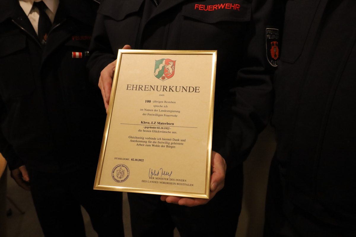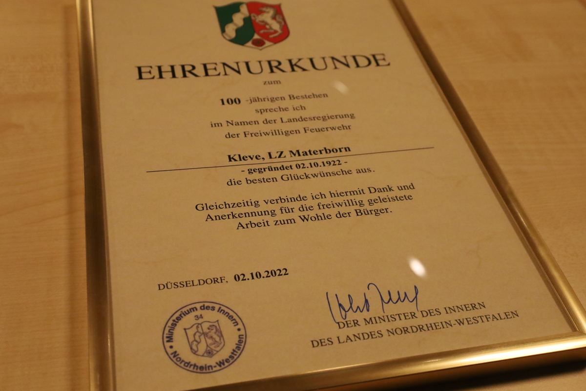 Der Löschzug Materborn feierte im Jahr 2022 sein Einhundertjähriges bestehen. Hunderte Feuerwehrleute kamen zum Stadtfeuerwehrfest in der Mehrzweckhalle. Nun gratulierte auch NRW-Innenminister Herbert Reul zum Jubiläum des Löschzugs – mit einer Ehrenurkunde. Diese wird sicherlich ihren Platz im neuen Feuerwehrhaus finden.