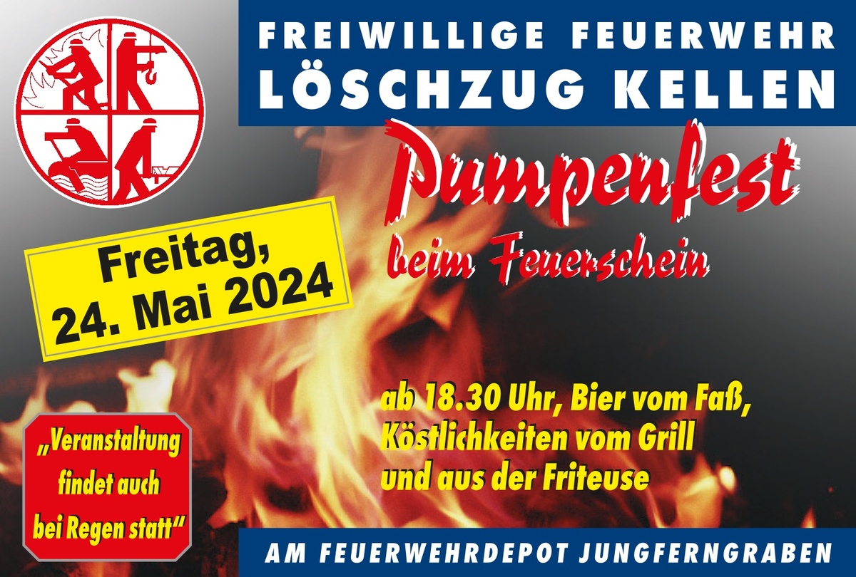 Der Löschzug Kellen veranstaltet am Freitag, dem 24. Mai wieder das „Pumpenfest beim Feuerschein“. Um 18:30 Uhr geht es los. Veranstaltungsort ist das Kellener Feuerwehrhaus am Jungferngraben.