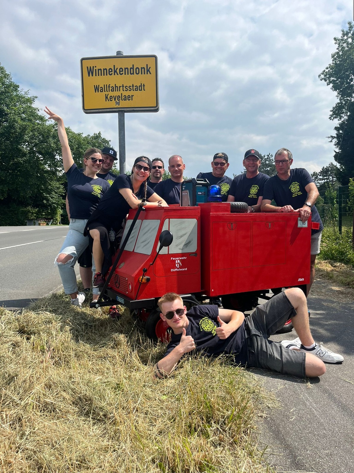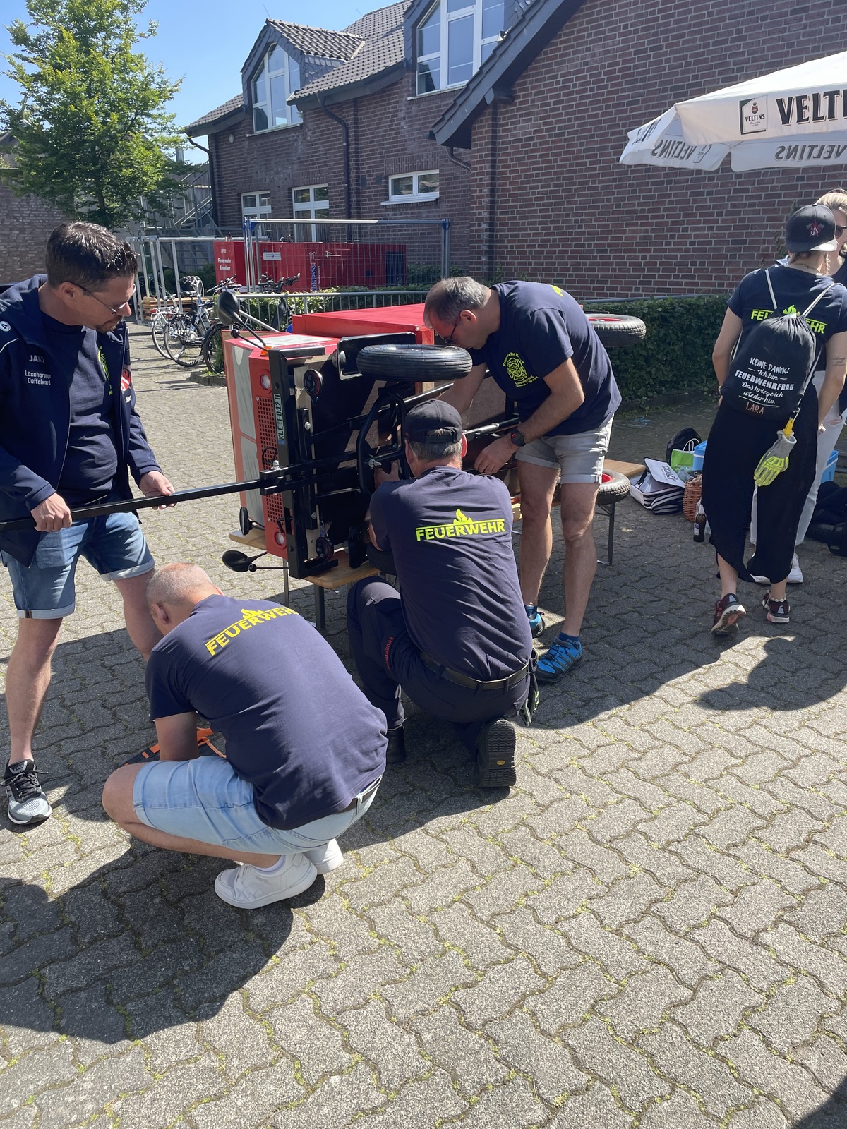 Das Team der Löschgruppe Düffelward, das mit dem Mini-Unimog (einem umgebauten Bollerwagen) antrat, hatte zunächst mit erheblichen technischen Problemen zu kämpfen. Ein platter Vorderreifen und eine defekte Lenkung stellten die Kameradinnen und Kameraden schon vor dem Start vor große Herausforderungen. Doch man ließ sich nicht entmutigen und begann, die Hindernisse mit Teamgeist, Improvisationstalent und der Hilfe der Kameradinnen und Kameraden des Löschzugs Winnekendonk zu überwinden.