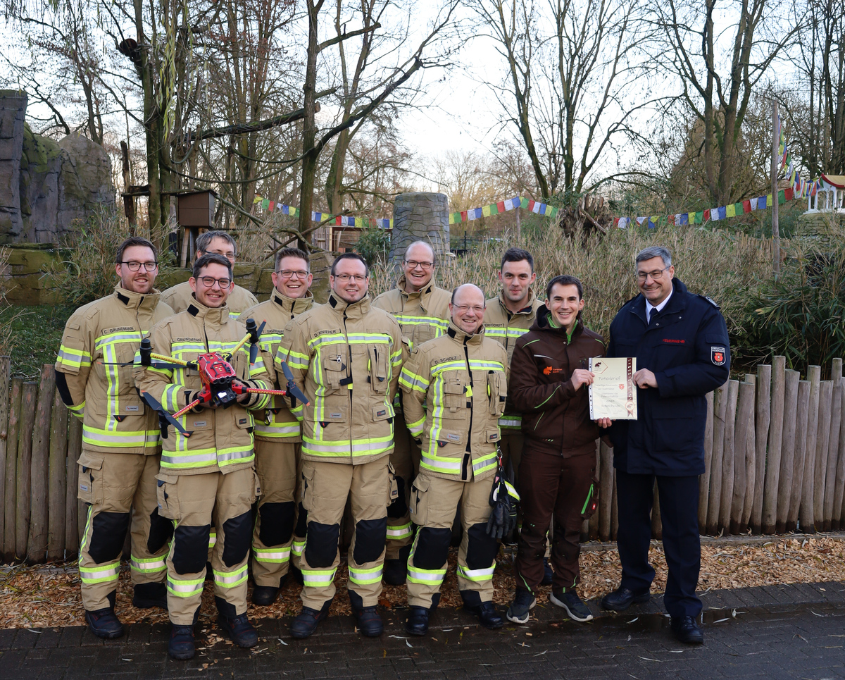 Ende Oktober war das Rotes-Panda-Weibchen „Kamala“ aus dem Tiergarten Kleve auf Abwegen. Mithilfe einer Wärmebilddrohne der Feuerwehr konnte Kamala in kürzester Zeit aufgespürt, mit einer Drehleiter aus dem Baum gekeschert und sicher und wohlbehalten in die Rote-Panda-Anlage zurückgebracht werden. Aufgrund der erfolgreichen Tierrettung darf die Feuerwehr Kleve nun eine Patenschaft für die roten Pandas übernehmen. In der vergangenen Woche hat Tiergartenleiter Martin Polotzek offiziell die Patenurkunde an den Leiter der Feuerwehr, Ralf Benkel, überreicht.