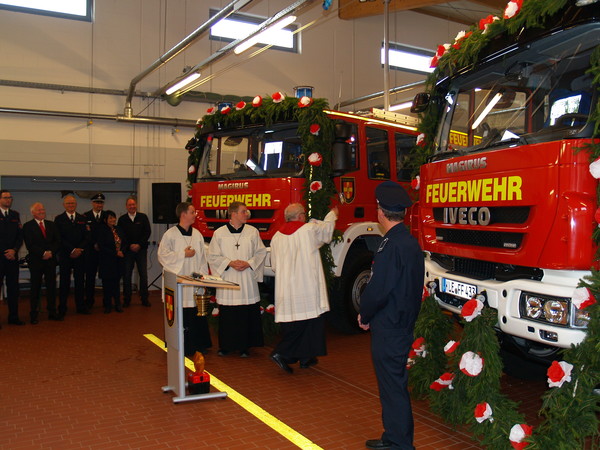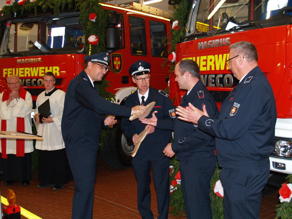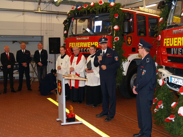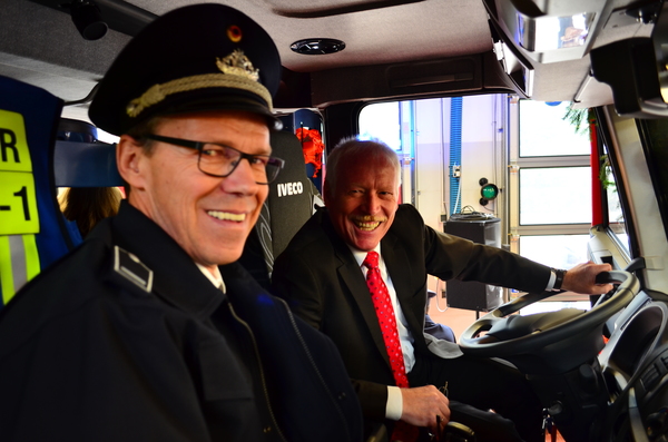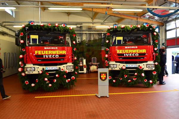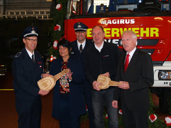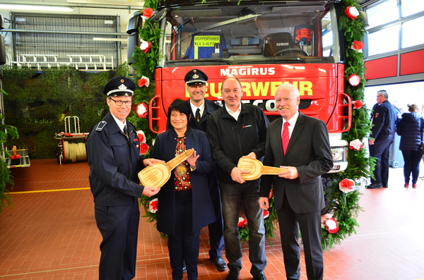 Die Bürgermeisterin übergab im Rahmen einer Feierstunde symbolisch die beiden Schlüssel an den Leiter der Feuerwehr Kleve, Ralf Benkel. Dieser reichte die Schlüssel, ebenfalls mit den besten Wünschen, an Löschzugführer Rolf Tepest weiter. Pfarrer Stefan Notz segnete die Fahrzeuge ein. Kleves Kämmerer Willibrord Haas ließ von sich von Rolf Tepest im Anschluss die Vorzüge der neuen Fahrzeuge aus dem Führerhaus erklären.