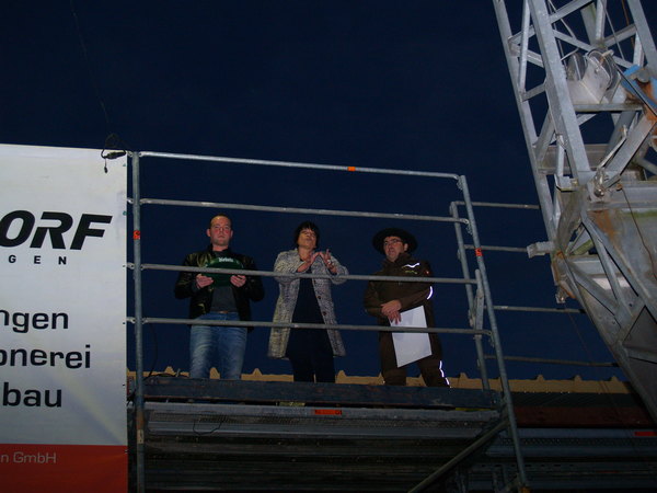 Der Richtspruch wurde von Zimmermannsmeister Klaus Oenings von der Firma Moll und Bruns (rechts im Bild) vorgetragen. Es assistierte Sebastian Rambach von der Baufirma Goris (links im Bild). Die Bürgermeisterin betonte in Ihrer Rede noch einmal den Stellenwert der Feuerwehr und freute sich über über den personellen Zuwachs der Löschgruppe Düffelward.