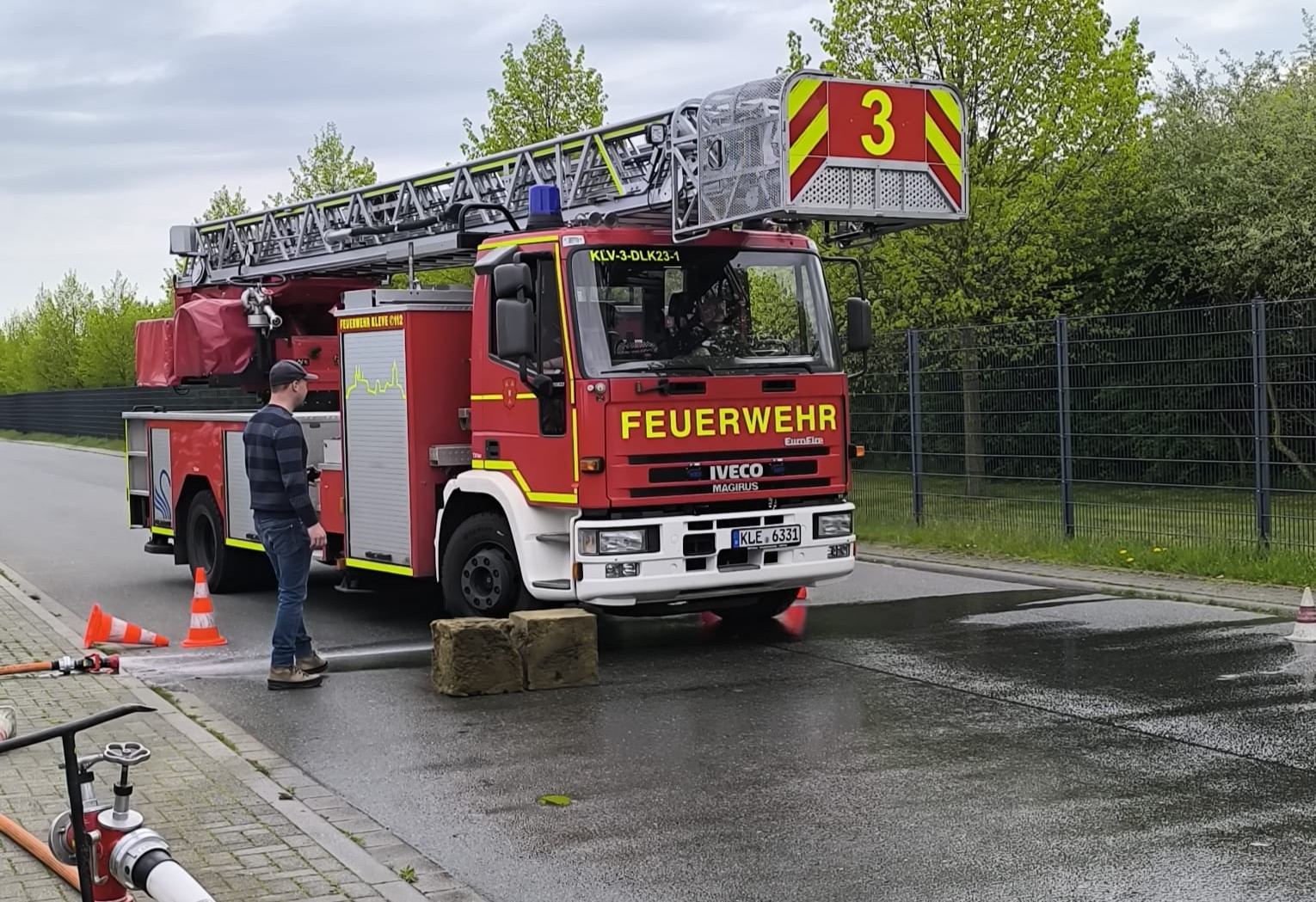 Die Freiwillige Feuerwehr Kleve führte im Industriegebiet ein Fahrsicherheitstraining für Großfahrzeuge durch. Geübt wurden unter anderem Gefahrenbremsungen, Ausweichmanöver und ein Slalomparcours zur Verbesserung des Fahrzeughandlings.