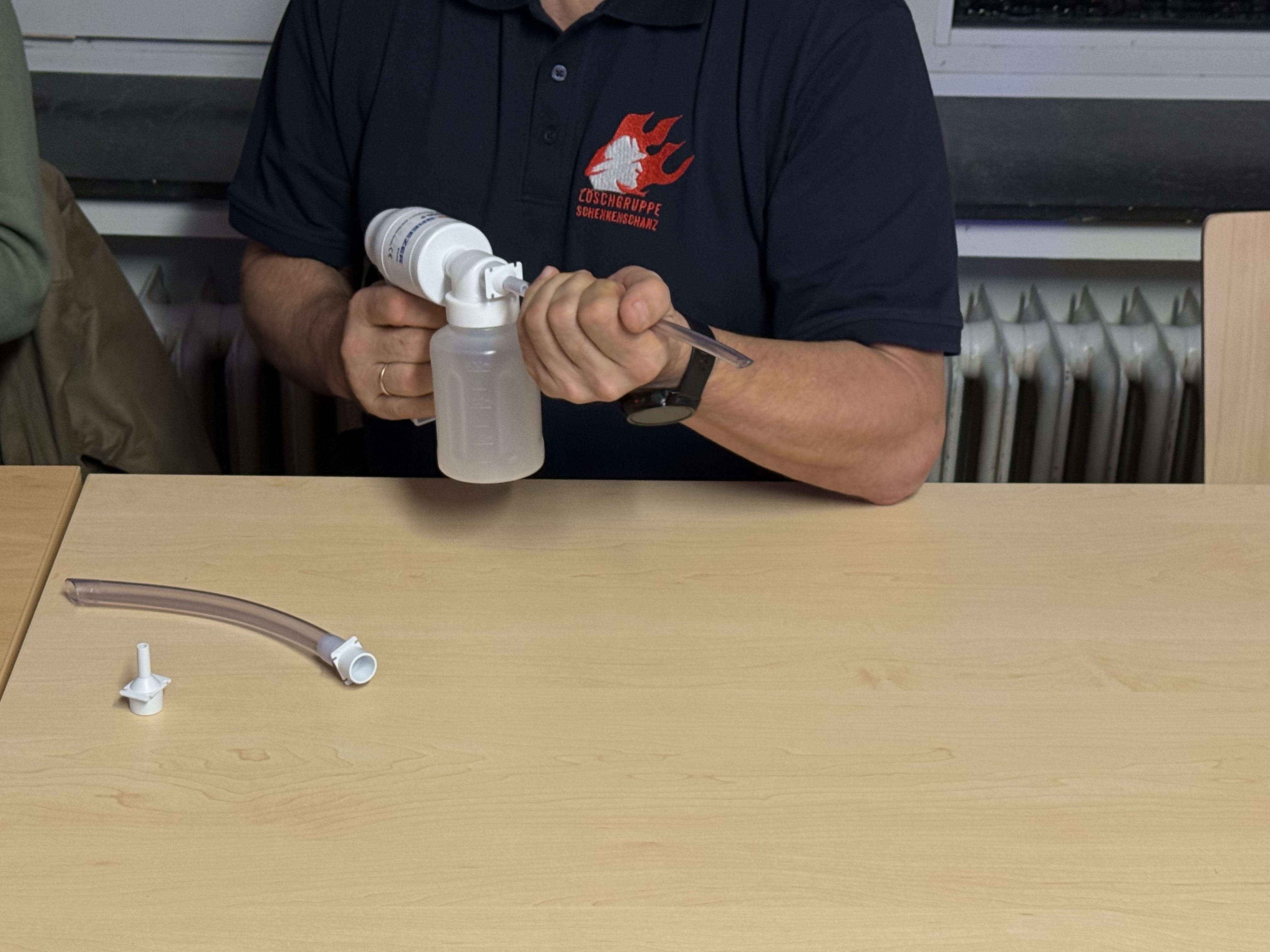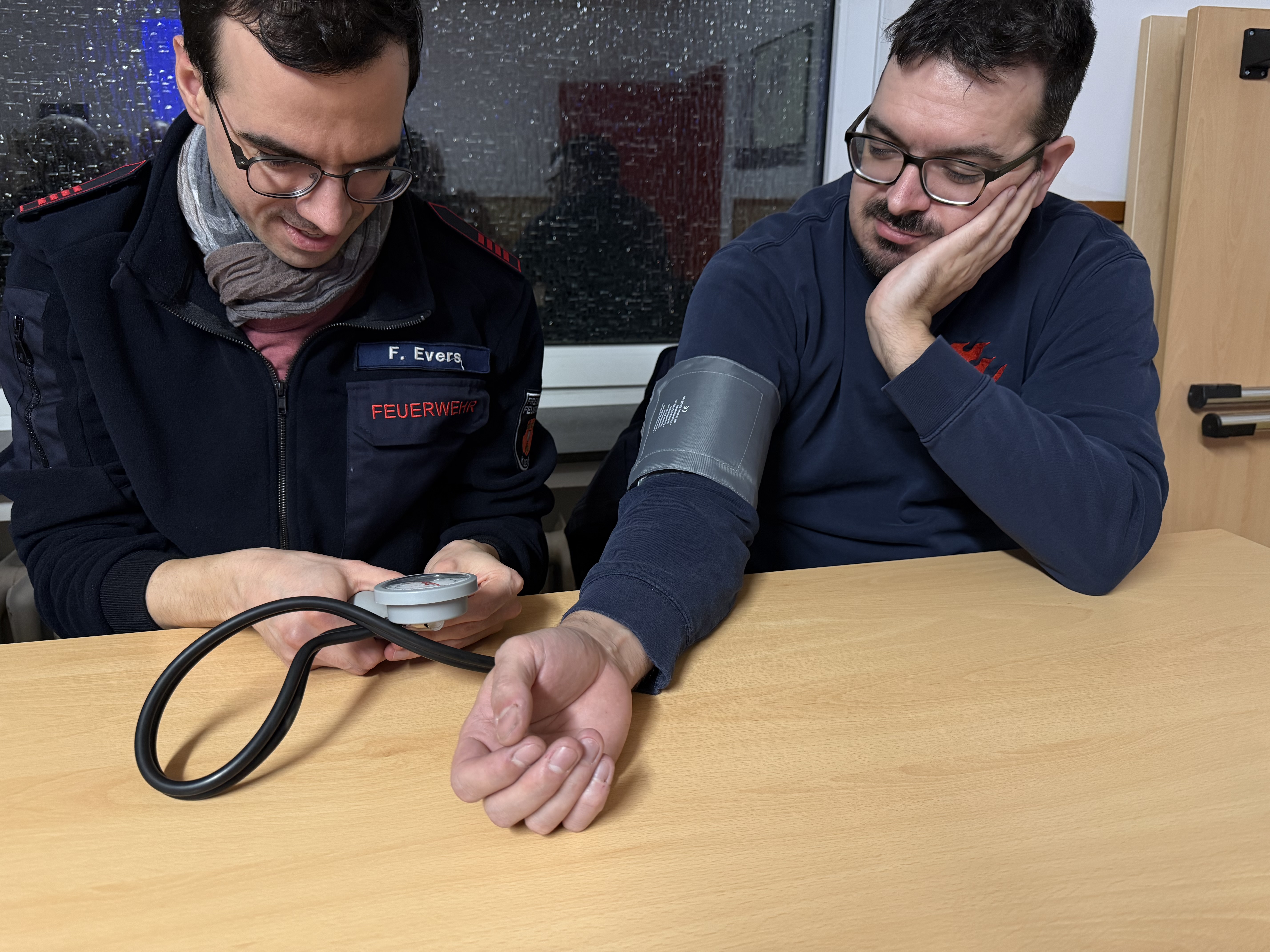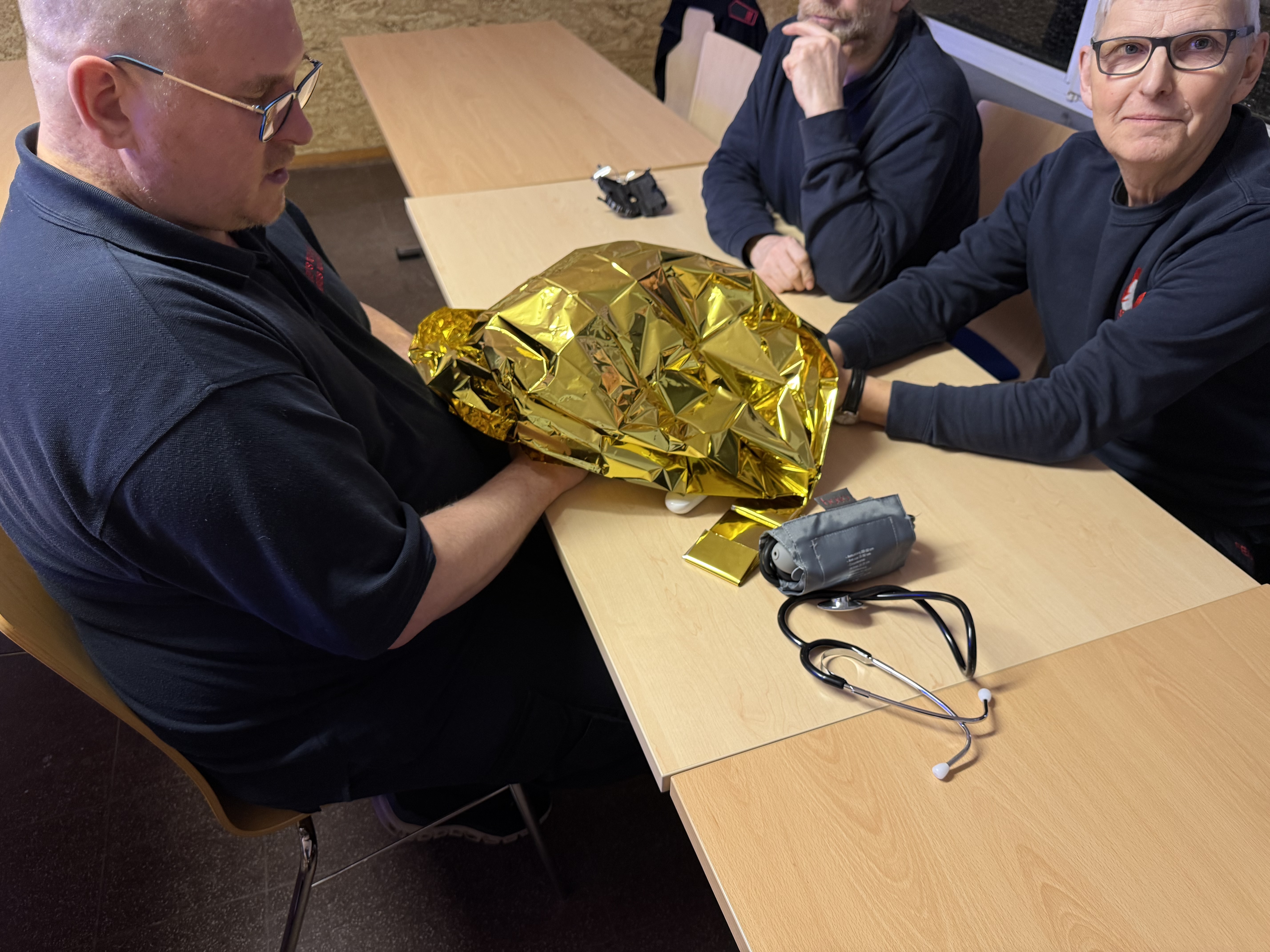 Zu den Ausbildungsinhalten gehörten unter anderem das Anlegen eines Stiffnecks zur Stabilisierung der Halswirbelsäule, das Schienen von Frakturen, das Messen von Blutdruck und Sauerstoffsättigung sowie Maßnahmen der Reanimation mit Herz-Lungen-Wiederbelebung. Darüber hinaus wurden das strukturierte Vorgehen an Einsatzstellen und die Beurteilung der Lage trainiert. Ein besonderer Schwerpunkt lag auf dem sogenannten XABCDE-Schema, das Einsatzkräften eine klare Struktur bei der Patientenversorgung gibt. Ergänzend wurden Maßnahmen zur Atemwegssicherung, Lagerung und Beatmung von Patienten sowie der Umgang mit Betroffenen und deren Angehörigen geübt. Für solche Einsatzlagen stehen der Löschgruppe Schenkenschanz zwei speziell ausgestattete Notfallrucksäcke zur Verfügung. Damit können wichtige rettungsdienstliche Basismaßnahmen durchgeführt werden, bis ein Transport des Patienten möglich ist.
