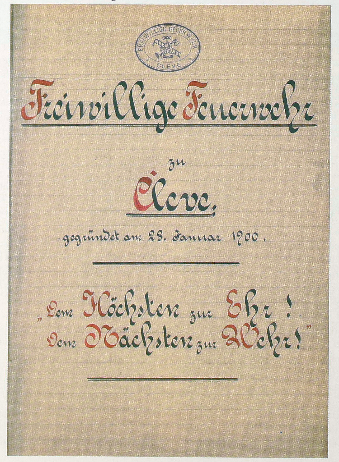 Trotz solcher Vorgaben blieb der Brandschutz lange lückenhaft. Ein vermutlich durch einen Kamin ausgelöster Wohnungsbrand in der Nacht zum 27. Dezember 1899 auf der Stechbahn sorgte für öffentliche Kritik am damaligen Feuerschutz. Der Klever Radfahrverein unter Vorsitz von Ingenieur Paul Rütter rief daraufhin zur Neuaufstellung auf – und keine vier Wochen später, am 23. Januar 1900, wurde die Freiwillige Feuerwehr Kleve gegründet. Bemerkenswert: Bereits einen Tag nach ihrer öffentlichen Vorstellung rückte die neue Wehr zu ihrem ersten Einsatz aus.